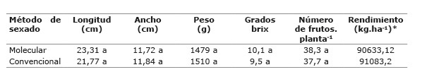 El tamaño, forma, dimensiones y número de los frutos por planta en ambos métodos de sexado, correspondieron a los determinados para el híbrido Pococí en la misma zona de estudio ( Mora y Bogantes, 2004). No hubo variación entre plantas de ambos métodos de sexado para estas variables. Los resultados obtenidos en el presente estudio coincidieron con lo determinado por Fitch et al. (2005b) para el híbrido Rainbow; pero difirieron de los resultados de Salinas et al. (2018) para el cultivar BH-65, quienes observaron que los frutos de plantas SM presentaron una mayor longitud y diámetro en comparación con frutos de plantas SC.