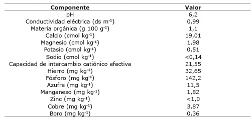 El suelo donde se realizó el experimento presentó una estructura franco-arenosa, con pH entre 6,2 a 6,4, materia orgánica de 0,7 a 1,3 %, sin aluminio ni salinidad ( Cuadro 1) y con buen drenaje.