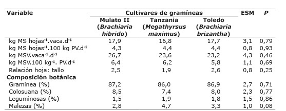 No se presentó interacción entre el tratamiento x periodo (p>0,05). De acuerdo con lo planificado, la oferta de materia seca verde (MSV) (hojas y tallos) y hojas expresadas en kg.animal -1.100 kg -1 de peso vivo (PV).día-1, fueron similares (p>0,05) para los tres cultivares de gramíneas (23,2 a 26,7 kg MSV -1.vaca.d -1) ( Cuadro 2). La composición botánica de las pasturas fue dominada por las gramíneas sembradas ya que la contribución de otras especies fue baja y similar en los tres tratamientos ( Cuadro 2).