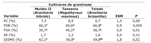 Table 3. Nutritional quality of three cultivars of tropical grasses evaluated under grazing in San Diego, Cesar Department, Colombia, May-June. 2013.