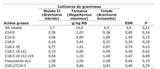 No se presentó interacción entre el tratamiento y el periodo experimental (p>0,05) en las variables evaluadas. El contenido de ácidos grasos totales (g kg.MS -1) y la mayoría de AG individuales fueron similares (p>0,05) en los tres cultivares de gramíneas ( Cuadro 3). Sin embargo, el contenido de ácido linolénico (C18:3 c9 c12 c15) tendió (p<0,10) a ser mayor en los pastos Tanzania y Toledo en comparación con Mulato II, y la relación ácido linoleico/linolénico fue numéricamente mayor en el pasto Mulato II ( Cuadro 4).