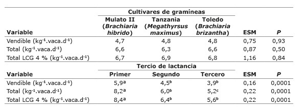 No hubo interacción del tratamiento y el tercio de lactancia (p>0,05) en las variables evaluadas. La producción de leche vendible, total por vaca (vendible + consumida por el ternero) y corregida por grasa al 4 % fue similar (p>0,05) en los tres cultivares de gramíneas ( Cuadro 4). Como era de esperarse, la producción diaria de leche (vendible, total y corregida por grasa al 4 %) disminuyó a medida que aumentó el tercio de lactancia ( Cuadro 5).