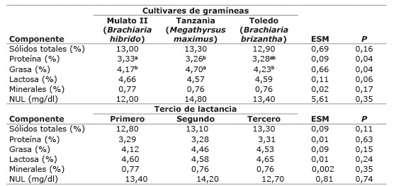 ESM: error estándar de la media. LCG (Leche corregida por grasa 4 %) = (0,4 x PLT) + 15 x kg G. PLT: producción de leche total. G: grasa kg.d-1. Letras diferentes en la misma fila indican diferencias significativas (P>0,05) según prueba de Tukey / ESM: Treatments standard error of the mean. LCG (Milk corrected by 4% fat)= (0.4 x PLT) + 15 x kg G. PLT: total milk production. G: fat kg.d-1. Different letters in the same row indicate significant differences (P>0.05) according to Tukey’s test.Las concentraciones de sólidos totales, lactosa, minerales y nitrógeno ureico (NUL) en la leche vendible de las vacas fueron similares (p>0,05) en los diferentes cultivares de gramíneas ( Cuadro 6). Sin embargo, la concentración de proteína y de grasa fue mayor (p<0,05) en la leche de vacas que consumieron el pasto Mulato II y Tanzania, respectivamente ( Cuadro 5). El tercio de lactancia no afectó (p>0,05) la concentración de sólidos totales, proteína, grasa, lactosa y minerales en la leche vendible de las vacas ( Cuadro 6).