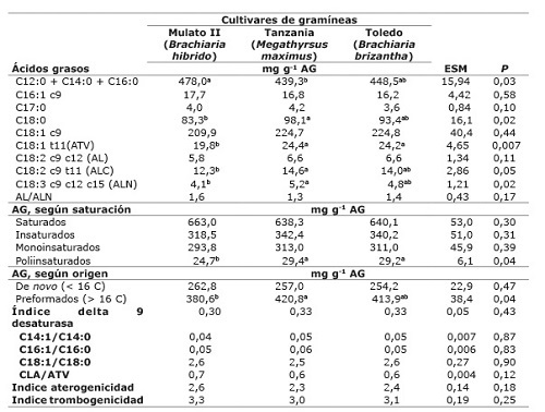 ATV: ácido transvaccénico. AL: ácido linoleico. ALC: ácido linolénico conjugado. ALN: ácido linolénico. ESM: error estándar de la media de los tratamientos. Letras diferentes en la misma fila indican diferencias significativas (p>0,05) según prueba de Tukey / ATV: transvaccenic acid. AL: linoleic acid. ALC: conjugated linolenic acid. ALN: linolenic acid. ESM: treatments standard error of the mean. Different letters in the same row indicate significant differences (p>0.05) according to Tukey’s test.La concentración de ácidos grasos de síntesis de novo en la grasa de la leche fue similar (p>0,05) en las vacas alimentadas con los tres cultivares, pero con el pasto Tanzania se presentó una mayor (p<0,05) concentración de ácidos grasos preformados en la grasa de la leche. La concentración de ácidos grasos poliinsaturados en la grasa de la leche fue mayor (p<0,05) en las vacas alimentadas con el pasto Tanzania y Toledo en comparación con Mulato II ( Cuadro 6). Los índices de la delta 9 desaturasa, de sus productos/sustratos y los índices de aterogenicidad y trombogenicidad en la grasa de la leche de las vacas no se afectaron (p<0,05) por los diferentes cultivares ( Cuadro 7).