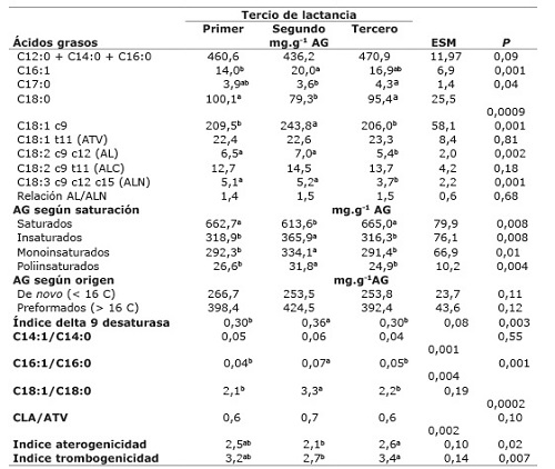 Las concentraciones de C16: y C18:1 fueron mayores en la grasa de la leche de las vacas en segundo tercio de lactancia debido posiblemente a mayor actividad de la delta 9 desaturasa en sus respectivos productos/sustratos (C16:1/C16:0 y C18:1/C18:0), que regula la producción de AG insaturados en la glándula mamaria y tejido adiposo de rumiantes ( Corl et al., 2001). Esta enzima actúa sobre diferentes sustratos (C14:0, C16:0, C18:0, C18:1 t11) para sintetizar C14:1, C16:1, C18:1, ALC c9 t11 en la glándula mamaria ( Ntambi y Makoto, 2003). Estos resultados son contrarios al estudio de Kgwatalala et al. (2009) con vacas Yersey, pues en este caso los autores no observaron diferencia en la concentración de C16:1, pero sí una menor concentración de C18:1 en la grasa de la leche en vacas de segundo tercio de lactancia.