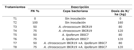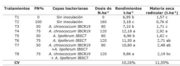Conclusión: Con base en los resultados obtenidos se puede inferir que la inoculación con A. chroococcum IBCR19 logró reducir en un 25 % los niveles de fertilización nitrogenada y constituye una cepa promisoria como bioestimulante.