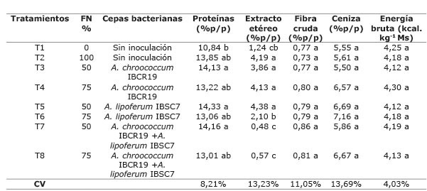 Medias con por lo menos una letra en común no difieren estadísticamente según prueba de Tukey (p≤0,05). CV: coeficiente de variación. FN: fertilización nitrogenada / Averages with at least one letter in common do not differ statistically according to Tukey’s test (p≤0.05). CV: coefficient of variation. FN: nitrogen fertilization.CV: coefficient of variation. FN: nitrogen fertilization.De igual forma, en la variable de extracto etéreo se presentaron diferencias significativas entre los tratamientos inoculados (p≤0,05) respecto al tratamiento sin inoculación al 0 % FN. Los valores medios en los tratamientos T5, T4 y T3 presentaron incrementos con el tratamiento sin inoculación 100 % FN en un 253, 233 y 211 %, respectivamente. En las variables de ceniza y fibra cruda no se encontraron diferencias estadísticas; sin embargo, las cenizas se incrementaron con respecto al T1 en los tratamientos T5, T8, T6, T4 y T7 con un 21, 20, 29, 18 y 6 %, respectivamente, y respecto al T2 en los tratamientos T6, T5, T8, T4 y T7 en un 8, 19, 18, 17 y 4 %, respectivamente. Los valores de fibra cruda mostraron aumentos en los tratamientos T7, T8, T4, T5, T6 y T3 en un 18, 11, 10, 8, 8, y 5 %, respectivamente, en comparación con el tratamiento sin inoculación 0 % FN. Asimismo, se presentaron incrementos en los tratamientos T7, T8, T5, T6 y T4 respecto al tratamiento sin inoculación 100 %NF en un 11, 5, 2, 2 y 4 %, respectivamente ( Cuadro 4). En cuanto a la variable de energía bruta no se encontraron diferencias significativas (p≤0,05), el T4 presentó un aumento de 1,7 % respecto a T1 y de un 2,8 % respecto a la aplicación del T2 ( Cuadro 4).