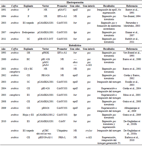 En 2009, callos embriogénicos derivados de segmentos de hoja de C. arabica L. se bombardearon con el vector pBI426 ( nptII y gus) dirigido por el promotor doble CaMV35S. Posteriormente, en medio de selección con kanamicina se obtuvieron embriones somáticos que resultaron positivos para la prueba histoquímica gus, y amplificaron un fragmento específico del gen nptII por PCR. Además, por medio de la técnica de southern blot se obtuvo un número bajo de copias integradas del gen nptII. Finalmente, los embriones somáticos se desarrollaron a plantas, en las que las flores y frutos fueron positivas para la prueba gus, demostrando una transformación estable ( Albuquerque et al., 2009).