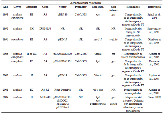 La especie bacteriana Agrobacterium rhizogenes se ha utilizado en café ( Cuadro 2), mayoritariamente para el análisis funcional de genes relacionados con resistencia al nematodo de la raíz ( Meloidogyne coffeicola) ( Alpizar et al., 2007). Fue utilizada inicialmente en este cultivo en el año 1993 ( Spiral et al., 1993) y luego en 1997 ( Leroy et al., 1997), en estos trabajos se transformaron embriones somáticos de C. canephora P. con la cepa A4 (genes gus y nptII), obteniéndose plantas transgénicas. Además de la cepa A4, se ha utilizado la cepa IFO14554 en segmentos de hoja de C. arabica L., con la que se obtuvo la integración de los transgenes pero no la regeneración de embriones somáticos ( Sugiyama et al., 1995).