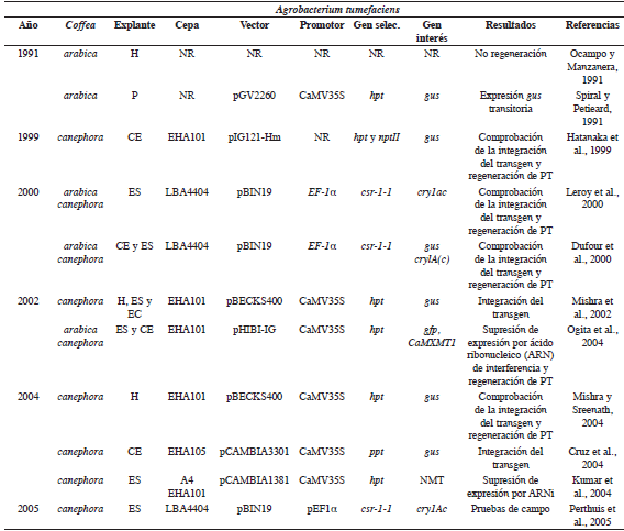 En el 2004, se publicaron dos metodologías para obtener altas eficiencias en el cultivo de café. En la primera se utilizaron hipocótilos de los cultivares S274 y CxR de C. canephora P., se transformaron con la cepa EHA101, con el plásmido pBECKS ( gus, nptII y el gen de resistencia a la higromicina hpt). Al colocar los explantes en un medio de precultivo MS complementado con 0,1 mg.l -1 de 2,4-D + 1 mg.l -1 de ácido indol-acético (AIA) + 4 mg.l -1 de kinetina por tres días en oscuridad y luego en cocultivo a 22 °C, se obtuvieron plantas transformadas establemente de ambos cultivares ( Mishra y Sreenath, 2004). En la segunda metodología se utilizaron callos embriogénicos de C. canephora P. y se transformaron con la cepa EHA105, que contiene un plásmido con los genes ppt (resistencia a la fosfinotricina) y gus bajo el control del promotor CAMV35S. Luego de dos meses de cultivo de los callos transformados, se obtuvieron embriones somáticos en estado torpedo que expresaban el gen gus, determinado por prueba histoquímica, 54 embriones se aclimataron, para luego confirmar por PCR la integración estable del gen gus en todas las muestras ( Cruz et al., 2004).
