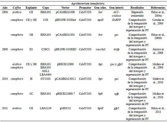 En 2006 se obtuvieron plantas transgénicas de C. canephora L. resistentes al herbicida glufosinato de amonio, luego de transformar segmentos de hoja con A. tumefaciens EHA105, la cual contenía el plásmido pCAMBIA3301 con el promotor 35S controlando los genes bar y uidA ( Ribas et al., 2006b). En ese mismo año y con el mismo tipo de explante, se insertaron los genes npt y el de la proteína roja fluorescente ( dsrfp), por medio de infiltración al vacío, luego del paso de embriogénesis somática y selección del material transgénico, se obtuvo un rendimiento de 33 % de embriones somáticos transformados ( Canche et al., 2006).