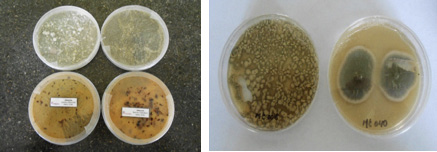 Figure 1. A. CPMa1104 and CPMa1105 M. anisopliae accessions from the microorganism collection of Cenipalma, Laboratory of Entomopathogenic Microorganisms, Bogotá, Colombia, 2016. B. Mt008 and Mt040 accessions of M. anisopliae, from the germplasm microorganism of biological interest bank of AGROSAVIA, Tibaitatá Research Center, Colombia. 2016.