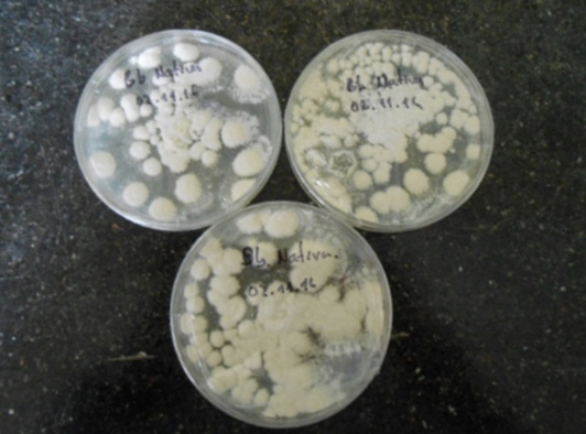 Figure 2. Native strain of B. bassiana Bv063 accession recovered from Rhynchophorus palmarum L. and isolated on PDA medium. Entomology Laboratory of La Libertad Research Center, Villavicencio, Meta, Colombia. 2017.