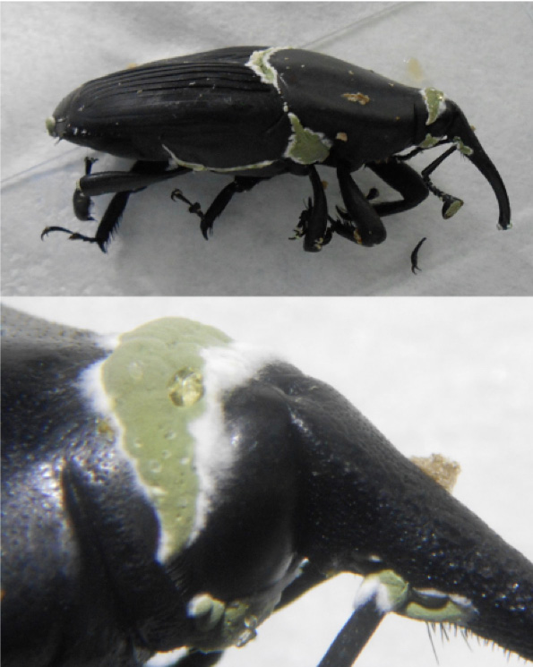 Figure 3. Sporulation of the M. anisopliae entomopathogen inoculated in adults of R. palmarum. La Libertad Research Center, Villavicencio, Meta, Colombia. 2017.