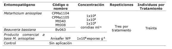 Se evaluaron cuatro cepas de M. anisopliae (CPMa1104, CPMa1105, Mt040 y Mt008), una cepa de B. bassiana nativa (Bv063) y un producto comercial (Anisafer WP), el cual es bioplaguicida con Registro ICA y composición garantizada de M. anisopliae 1x108 esporas g-1 y Bacillus popiliae 1x104 UFC g-1. En el Cuadro 1 se describen los tratamientos y concentraciones evaluadas.