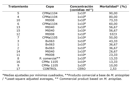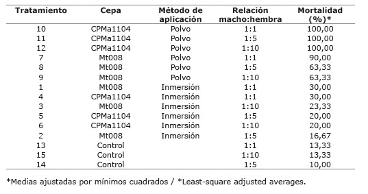 Al comparar las medias estimadas por mínimos cuadrados para la mortalidad (%) provocada por las cepas y sus respectivas concentraciones en conidias ml-1, sobre los individuos de R. palmarum, se observó que los mayores porcentajes, se obtuvieron con la cepa CPMa1104 (M. anisopliae), mientras que la cepa CPMa1105 presentó la más baja mortalidad y las cepas Mt008, Mt040 (M. anisopliae) y Bv063 (B. bassiana), mostraron valores medios; el producto comercial generó una mortalidad baja (Cuadro 2).