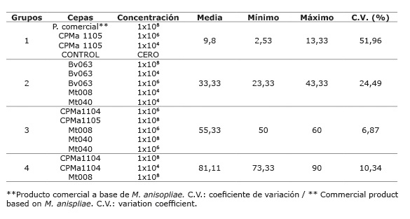 Debido al alto número de combinaciones de cepas y sus concentraciones, y para facilitar la interpretación de los resultados, se decidió realizar un análisis de conglomerados, mediante el procedimiento CLUSTER (algoritmo de Ward) del software SAS®, para clasificar los tratamientos con base en las medias ajustadas por mínimos cuadrados. Este análisis permitió conformar cuatro grupos de tratamientos que se describieron mediante estadísticas básicas (media, valores mínimos y máximos y coeficiente de variación) (Cuadro 3). Como se pudo observar, la mayor mortalidad correspondió al grupo 4, que incluyó a los tratamientos de las cepas CPMa1104 (M. anisopliae) en concentraciones de 1x108 y 1x104 conidias ml-1 y Mt008 (M. anisopliae) en concentración 1x108. La mortalidad más baja correspondió al grupo 1 con los tratamientos que correspondieron al producto comercial, la cepa CPMa1105 (M. anisopliae) en concentraciones de 1x106 y 1x104 conidias ml-1, y al control sin aplicación. Los demás tratamientos incluidos en los grupos 2 y 3, presentaron mortalidades intermedias entre 23,3 y 60 %. De acuerdo con estos resultados, las cepas CPMa1104 y Mt008 (M. anisopliae) fueron seleccionadas para la fase 2 del estudio.