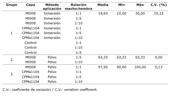 Para la mortalidad de hembras de R. palmarum, se conformaron tres grupos: el grupo 3 constituido por los tratamientos 7, 10, 11 y 12, fue el que mostró mayor mortalidad de hembras, que correspondieron a las cepas CPMa1104 inoculada a los machos en polvo, en las tres relaciones macho/hembra evaluadas, y la Mt008 aplicada a los machos en polvo, en la relación macho/hembra 1:1; el grupo 2 reunió los tratamientos 8 y 9 de mortalidad intermedia, es decir, la cepa Mt008 inoculada a los machos en polvo en las relaciones macho/hembra 1:5 y 1:10; y el grupo 1 congregó los tratamientos con menor mortalidad que corresponden a las cepas Mt008 y CPMa1104, aplicadas a los machos mediante el procedimiento de inmersión y al tratamiento control absoluto sin inoculación del entomopatógeno (Cuadro 5).