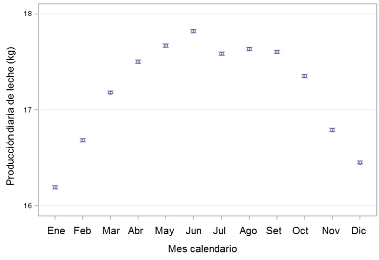 Figure 6. Marginal means with 95 % confidence intervals for the daily milk production variable (kgl) as a function of the calendar month. Costa Rica. Period 1990-2015.