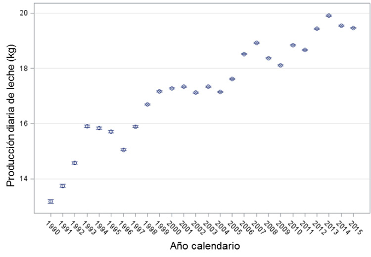 Figure 7. Marginal means with 95 % confidence intervals for the daily milk production variable (kgl) as a function of the year. Costa Rica. Period 1990-2015.