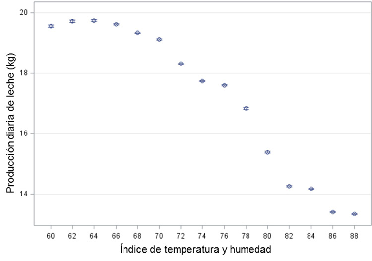 El estrés calórico se produce cuando el ITH es elevado y afecta negativamente la producción de leche (Bouraoui et al., 2002; West et al., 2003; Bohmanova et al., 2007; Gantner et al., 2011; Hammami et al., 2013; Zewdu et al., 2014; Garcia et al., 2015; Pragna et al., 2017). En el sur de Estados Unidos, la producción diaria de leche de vacas Holstein disminuyó cuando el ITH superó el valor de 72, con una tasa de reducción de 0,39 kg por cada unidad de incremento en ITH (Bohmanova et al., 2007). Otro estudio bajo condiciones similares informó sobre una reducción de 0,20 kg (Ravagnolo y Misztal, 2000). Mayores reducciones, en el orden de 0,88 y 0,60 kg, fueron reportadas en la producción diaria de vacas Holstein y Jersey, respectivamente, por cada unidad de incremento en ITH (West et al., 2003). En Etiopía, se reportó una reducción de hasta 190 kg en producción de leche por lactancia de vacas cruzadas Holstein×Deoni, por cada incremento de una unidad en el ITH máximo (Zewdu et al., 2014).