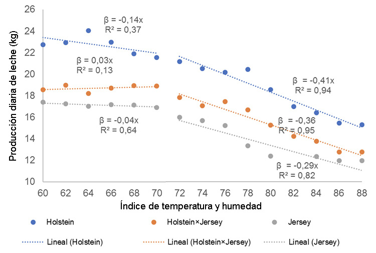 Al realizar el análisis dentro de cada grupo racial, se observó un patrón de reducción similar en producción asociado al incremento del ITH, con ligeras fluctuaciones (Figura 9). De acuerdo con un análisis de regresión lineal, en el rango de valores del ITH entre 60 y 72, se observó un impacto negativo pero no significativo (p>0,05) del ITH sobre la producción, con tasas de cambio de -0,14 (r2=0,37), +0,03 (r2=0,12) y -0,04 (r2=0,64) kg de leche diaria por cada unidad de incremento en el ITH para Holstein, Holstein×Jersey y Jersey, respectivamente. En el rango de ITH entre 74 y 88, el impacto negativo fue más consistente, con reducciones altamente significativas (p<0,0001) de 0,41 (r2=0,94), 0,36 (r2=0,95) y 0,29 (r2=0,82) kg de leche diaria por cada unidad de incremento en el ITH, respectivamente.
