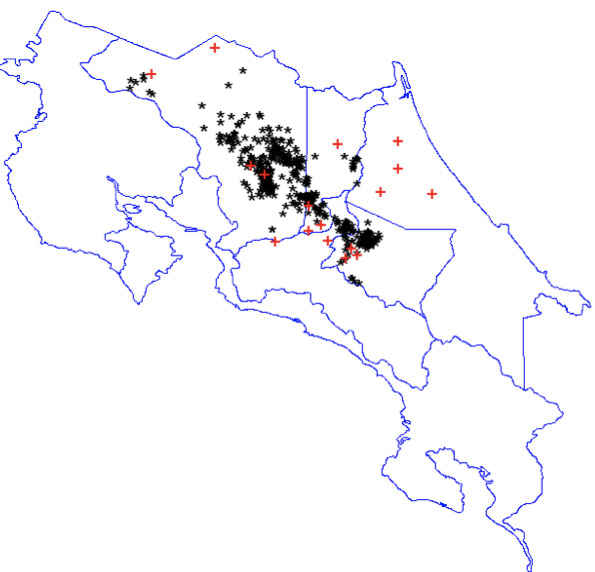 Figure 1. Geographical location of herds (*) and meteorological stations (+) included in the study to evaluate the association between temperature and humidity index (THI) and daily milk production (kgl). Costa Rica, period 1990-2015.