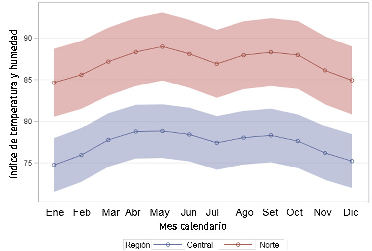 Figure 2. Marginal means and 95 % confidence bands for the variable index of temperature and humidity (TIH) depending on the months of the year and the climatic region. Costa Rica, period 1990-2015.