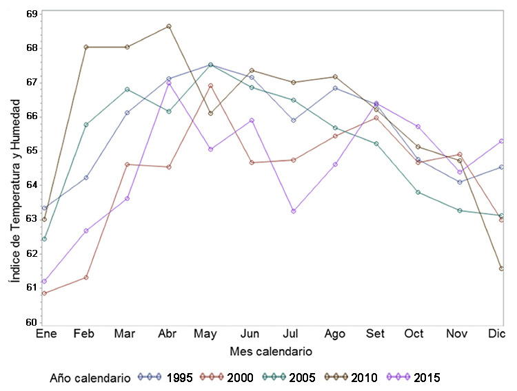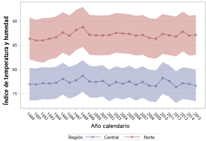Inicialmente, se realizó un análisis de estadística descriptiva de las variables climáticas disponibles, incluyendo el cálculo de medidas de tendencia central y dispersión, así como una exploración gráfica de la distribución de las variables y sus tendencias en tiempo y espacio. Se identificaron y eliminaron valores inusuales posiblemente causados por errores de medición, el criterio empleado fue >3,5 desviaciones estándares dentro de un mes y una región, partiendo del supuesto de una distribución aproximadamente normal de las variables analizadas. No se realizó ningún tipo de imputación de datos climáticos, solo se incluyeron los meses para los cuales se contó con valores reales de temperatura y humedad relativa. Posteriormente, se procedió al cálculo del índice de temperatura y humedad (ITH), para lo cual se utilizó la fórmula propuesta por el National Research Council (NRC, 1971), definida como ITH=(1,8×T+32)-[(0,55-0,0055×HR)×(1,8×T-26)], donde T corresponde a la temperatura ambiental bulbo seco (°C) y HR es el porcentaje de humedad relativa. Esta fórmula ha sido sugerida para ganado bajo pastoreo (NRC, 1971). Diferentes estudios han utilizado tanto la temperatura promedio (West et al., 2003; Bomahnova et al., 2007) como la máxima (St-Pierre et al., 2003; West et al., 2003; Bryant et al., 2007) en el cálculo de ITH. En el presente estudio se calcularon ambos valores de ITH (promedio y máximo), pero la evaluación de asociación entre el ITH y producción se realizó con base en la temperatura máxima, con el fin de obtener una estimación de los valores más altos de ITH a que pueden estar expuestos los animales durante el día bajo condiciones locales.