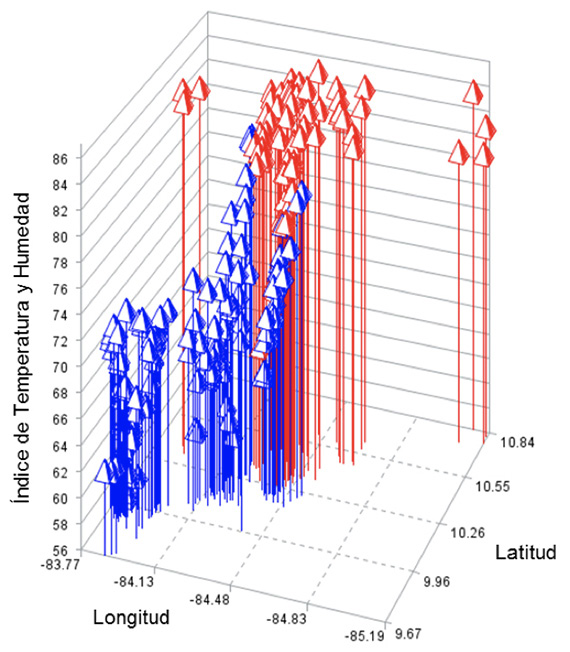 Figure 4. Predicted values of temperature index and humidity index (ITH) in the geographic coordinates (X= Longitude, Y= Latitude) of 220 herds located in the Central (blue) and North (red) regions of Costa Rica, contemporary to the month of January, year 2015.