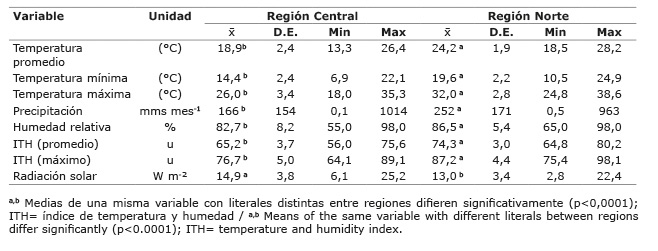 Los datos climáticos disponibles para el periodo analizado evidenciaron mayor temperatura, precipitación, humedad e ITH en la Región Norte, en comparación con la Región Central (p<0,0001) (Cuadro 1). Las diferencias fueron de 5,3, 7,7 y 6,0 °C en temperaturas promedio, mínima y máxima, respectivamente, 87 mms en precipitación mensual, 3,8% en humedad relativa, 9,1 en ITH promedio y 10,5 en ITH máximo. Por el contrario, el valor promedio de radiación fue mayor (1,9 W m-2) en la Región Central (p<0,0001). Las tendencias observadas para todas las variables climáticas disponibles fueron descritas en mayor detalle por Ruiz-Jaramillo (2017).