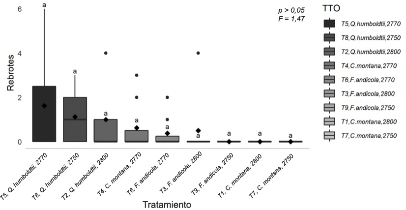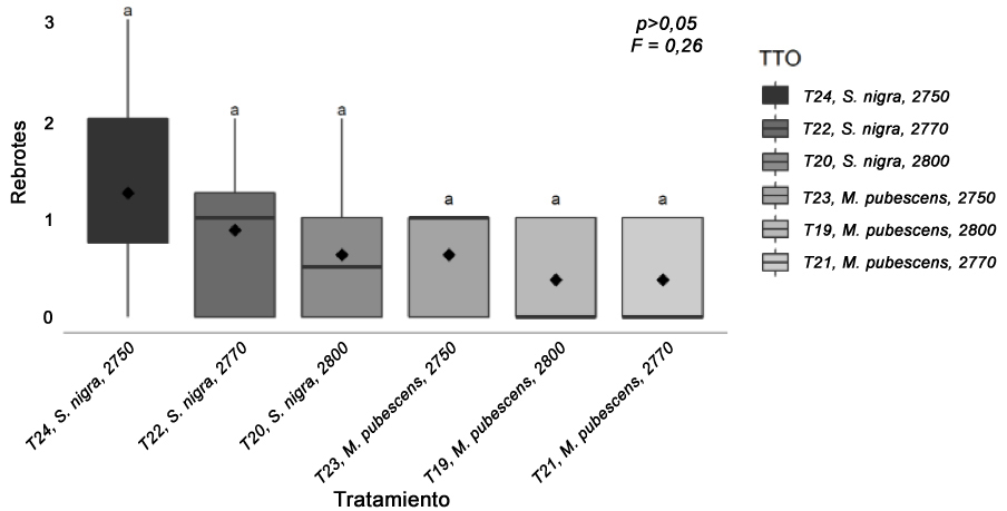 Los resultados no mostraron diferencias significativas para la variable número de rebrotes (p≥0,05) en los tres estratos evaluados (Figuras 7, 8 y 9).