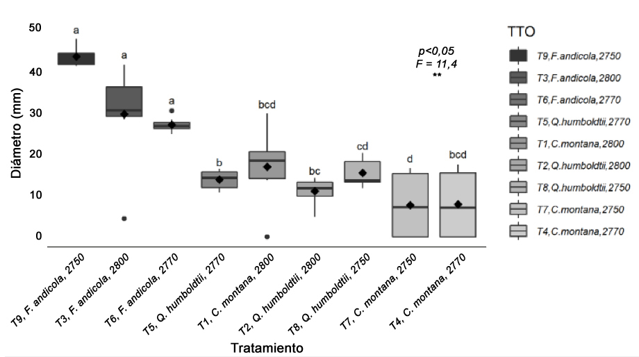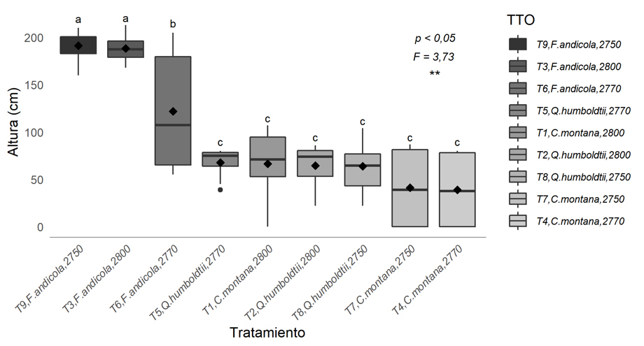 En la variable altura hubo diferencias significativas (p<0,05), donde F. andicola a 2750 msnm obtuvo el mayor valor con una media de 191,31 cm y diámetro de tallo de 42,98 mm; mientras que C. montana a 2750 msnm registró la mínima altura (39 cm) y diámetro (9,5 cm) (Figura 1).