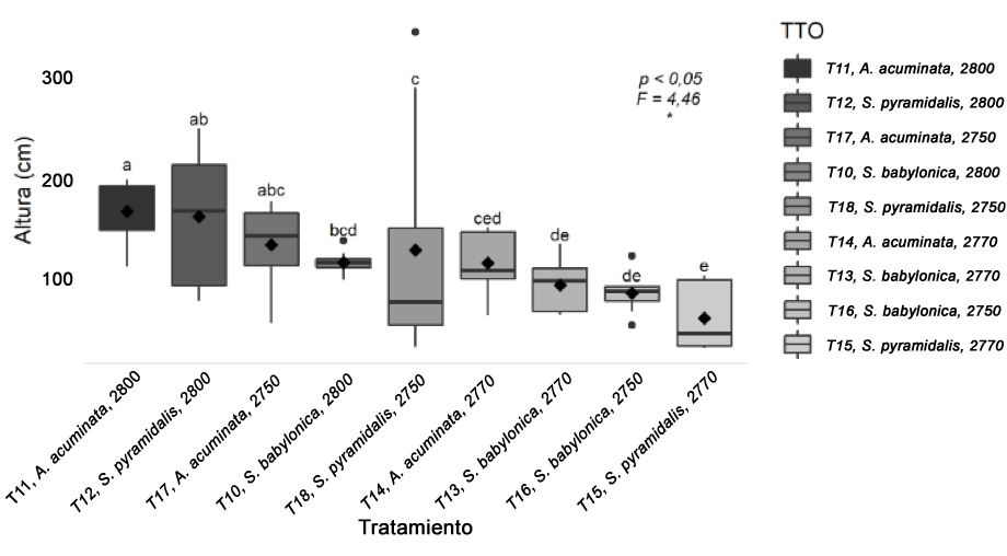 Figure 1. Effect of altitude on height in high stratum tree species, in the Obonuco Research Center, Corporación Colombiana de Investigación Agropecuaria. Pasto, Colombia. 2018.