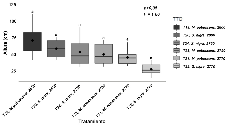 En el estrato bajo no se presentaron diferencias significativas. Sin embargo, se evidenció que M. pubescens a 2800 msnm presentó una tendencia superior al resto de los tratamientos con una media de 70,80 cm (Figura 3).