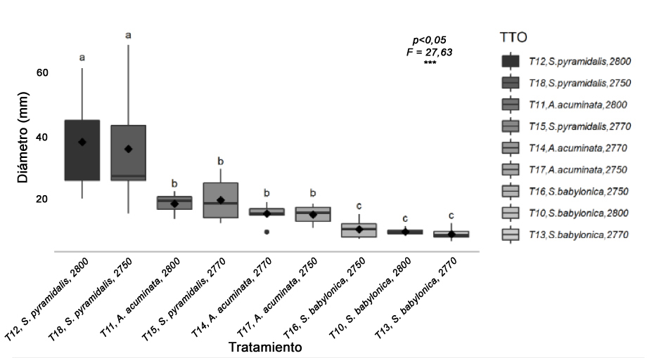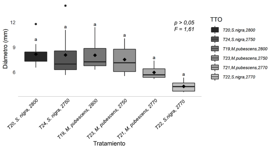 El análisis de varianza, para el estrato bajo en la variable diámetro no mostró diferencias (p>0,05) en los tratamientos. Sin embargo, se evidenció que la especie S. nigra a 2800 y 2750, presentó un diámetro superior a M. pubencens (Figura 6).