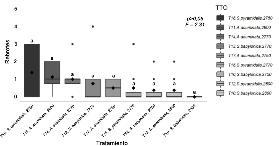 Para la especie S. pyramidalis se reportó que, generalmente, se adapta bien a los trópicos de altura en Colombia. En bosque altoandino del Parque Forestal Embalse del Neusa, Cundinamarca, se observó que S. pyramidalis fue una de las especies que más rebrotes registró y varió entre uno y seis (Gutiérrez, 2012). Dentro de la presente investigación, el máximo rebrote reportado fue uno, lo cual puede estar asociado a la buena calidad de las yemas terminales de la especie, relacionada con una dominancia apical que genera un efecto inhibidor de las partes apicales de la planta sobre las yemas laterales, debido a que en las yemas apicales normalmente se producen hormonas de crecimiento como las auxinas.