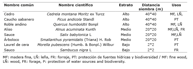 Table 2. Treatments to evaluate the growth and adaptation of eight tree/shrub species in a multi-layer live fence silvopastoral design, established as water source protector in the Research Center Obonuco, Corporación Colombiana de Investigación Agropecuaria (Agrosavia), Pasto, Colombia. 2018.