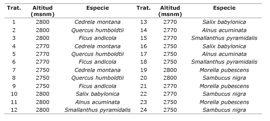 Se utilizó un diseño de bloques al azar con arreglo factorial. Se realizaron análisis de varianza, en los que se controlaron los efectos de especies arbóreas y arbustivas (8), la altitud (3) y su interacción (8 x 3), con un total de veinticuatro tratamientos con cuatro repeticiones (Cuadro 2). Para el análisis de los datos se agruparon las especies, donde para cada grupo se estudió la interacción con los tres niveles de altitud (2750, 2770 y 2800 msmn).