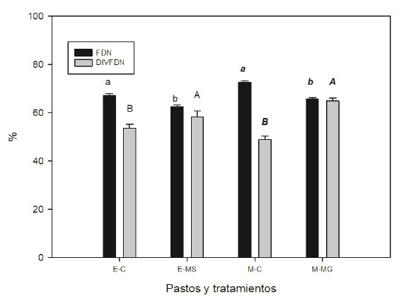 E-C= stargrass: control. E-MS= stargrass: experimental treatment. M-C= Mombasa: control, M-MG= Mombasa: experimental treatment. Different letters between means of fiber (uppercase) and fiber digestibility (lowercase) were different based on error type III.