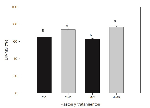E-C= estrella: control, E-MS= estrella: tratamiento experimental, M-C= Mombasa: control, M-MG= Mombasa: tratamiento experimental. Letras diferentes entre medias de la fibra (mayúsculas) y digestivilidad de la fibra(minúsculas) fueron differentes en base al error tipo III.