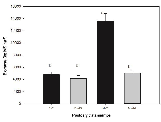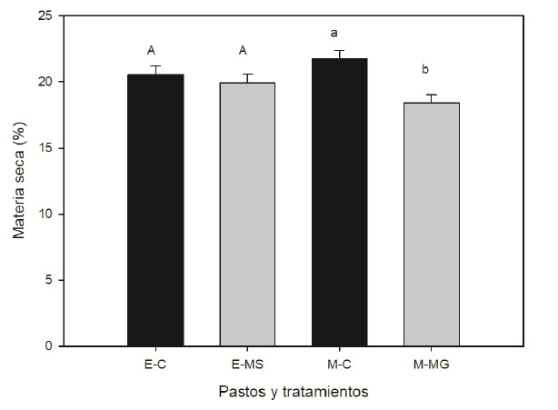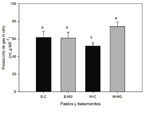 E-C= estrella: control, E-MS= estrella: tratamiento experimental, M-C= Mombasa: control, M-MG= Mombasa: tratamiento experimental. Letras diferentes entre medias de los tratamientos en estrella (mayúsculas) y Mombasa (minúsculas) fueron diferentes en base al error tipo III.