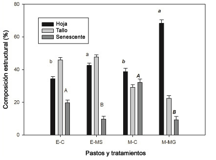 E-C= estrella: control, E-MS= estrella: tratamiento experimental, M-C= Mombasa: control, M-MG= Mombasa: tratamiento experimental. Letras diferentes entre medias de los componentes senescente (mayúsculas) y hoja (minúsculas) fueron differentes en base al error tipo III