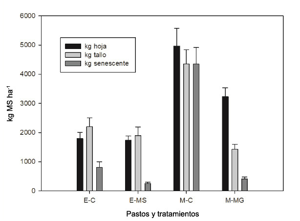 Al combinar los datos de biomasa con los componentes estructurales, se pudo observar que la remoción de la pastura senescente favoreció una menor acumulación de material senescente, con una disminución de dicho componente en 68 % y 91 %, en pastos estrella y Mombasa, respectivamente (Figura 4). En el pasto Mombasa la remoción de la pastura senescente disminuyó la producción de hojas y tallos en 35 % y 67 %, respectivamente.