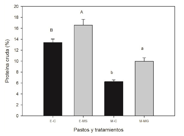 E-C= stargrass: control. E-MS= stargrass: experimental treatment. M-C= Mombasa: control, M-MG= Mombasa: experimental treatment. Different letters between means in stargrass (uppercase) andMombasa (lowercase) were different based on error type III.