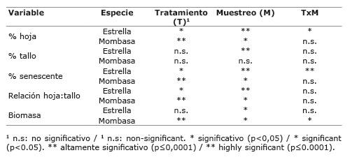 El pasto Mombasa tuvo una proporción de hoja significativamente mayor (p<0,05) que el control, casi del doble (63,5 vs 36,1 %), por efecto del tratamiento. El material senescente en Mombasa disminuyó significativamente (p≤0,0001), siendo una cuarta parte de lo que representaba en las parcelas sin remoción (8,0 vs 32,5 %). Los efectos principales de tratamiento y fecha de muestreo, tuvieron efectos significativos sobre ambos componentes en el pasto Mombasa (Cuadro 1).