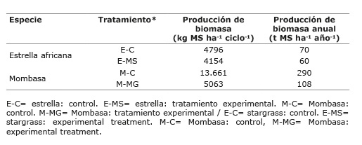 La producción de biomasa del pasto Mombasa al remover la pastura senescente se consideró aún alta, representando más de cien toneladas de materia seca por hectárea anualmente (Cuadro 2), mientras el control tuvo una producción cercana a tres veces la de este último. En el pasto estrella africana, el tratamiento produjo sesenta toneladas de materia seca anualmente, siendo el control levemente superior en su producción de biomasa anual.