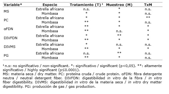 Table 3. Analysis of variance of the main effects and interactions included in the statistical model for the nutritional traits of African stargrass (Cynodon nlemfuensis Vanderyst.) and Mombasa (Megathyrsus maximus Jacq.) in Turrialba and San Carlos, respectively. Costa Rica. 2017.