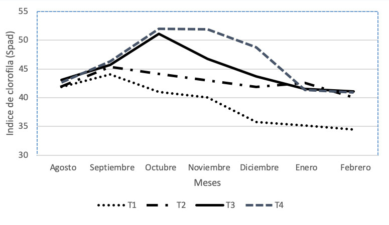 Se observó que para las evaluaciones iniciales (de agosto a octubre) no se presentaron diferencias significativas entre tratamientos (Figura 1), no obstante, a medida que se avanzó en el ciclo del cultivo se hicieron más evidentes los menores valores de Spad en el testigo (T1), lo cual denota que el grado de verdor de las hojas fue menor, esto dado por la posible deficiencia de nitrógeno. En el resto de los tratamientos estudiados, los valores incrementaron conforme las dosis de nitrógeno también aumentaron. Las evaluaciones correspondientes a los meses entre noviembre a febrero presentaron diferencias estadísticamente significativas entre tratamientos evaluados. Los primeros meses de evaluación no permitieron obtener respuestas diferenciadas entre los niveles de fertilización nitrogenada, fue a partir de octubre que se manifestaron tendencias en el índice de clorofila, de acuerdo con los niveles de fertilización. En este sentido, los valores normales para el cultivo se encontraron en el rango de 40 a 50 unidades Spad (Rodríguez, 2016). De esta forma, el tratamiento testigo (T1) fue el que presentó una disminución en el contenido por debajo de los valores adecuados para el cultivo. Es necesario indicar que dichas evaluaciones se realizaron desde la fase de crecimiento lateral de las ramas hasta la fructificación (siete meses continuos de evaluación desde agosto 2014 hasta febrero 2015).