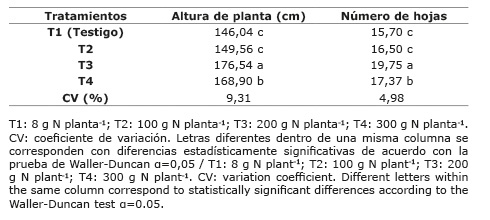 Los mayores valores en ambas variables (altura de planta y número de hojas) se encontraron con la dosis de 200 g de N planta-1 (T3), que superó a los encontrados con las dosis más elevada de N (T4).